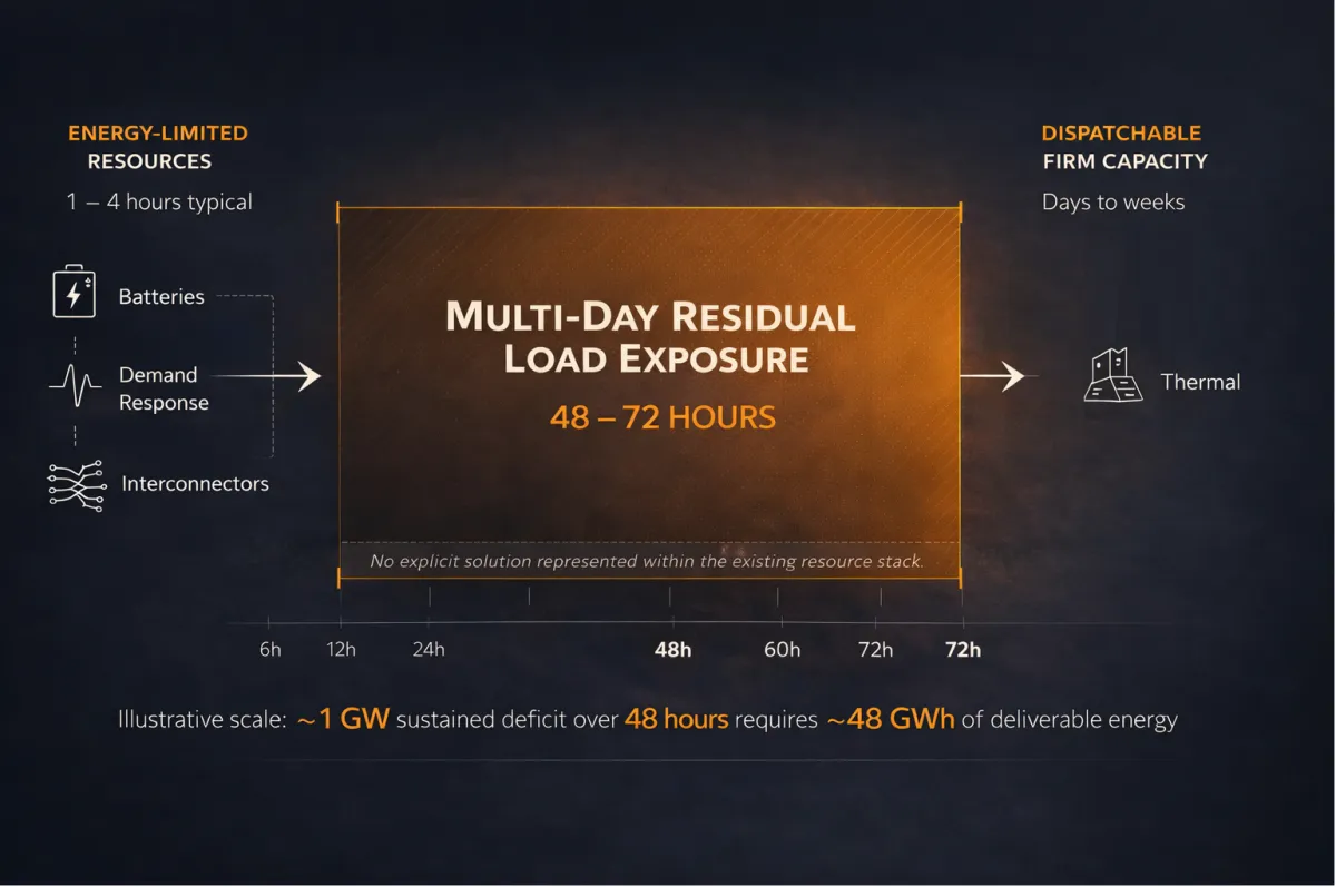 When wind generation collapses - not for minutes, not for hours, but for two or three consecutive days - the system faces a fundamentally different kind of problem. A 1 GW shortfall sustained over 48 hours represents a 48 GWh energy requirement. It is not a frequency event. It is not a ramping issue. It is a sustained energy balance requirement across consecutive settlement periods, and its explicit treatment within planning and operational frameworks is becoming increasingly material.
